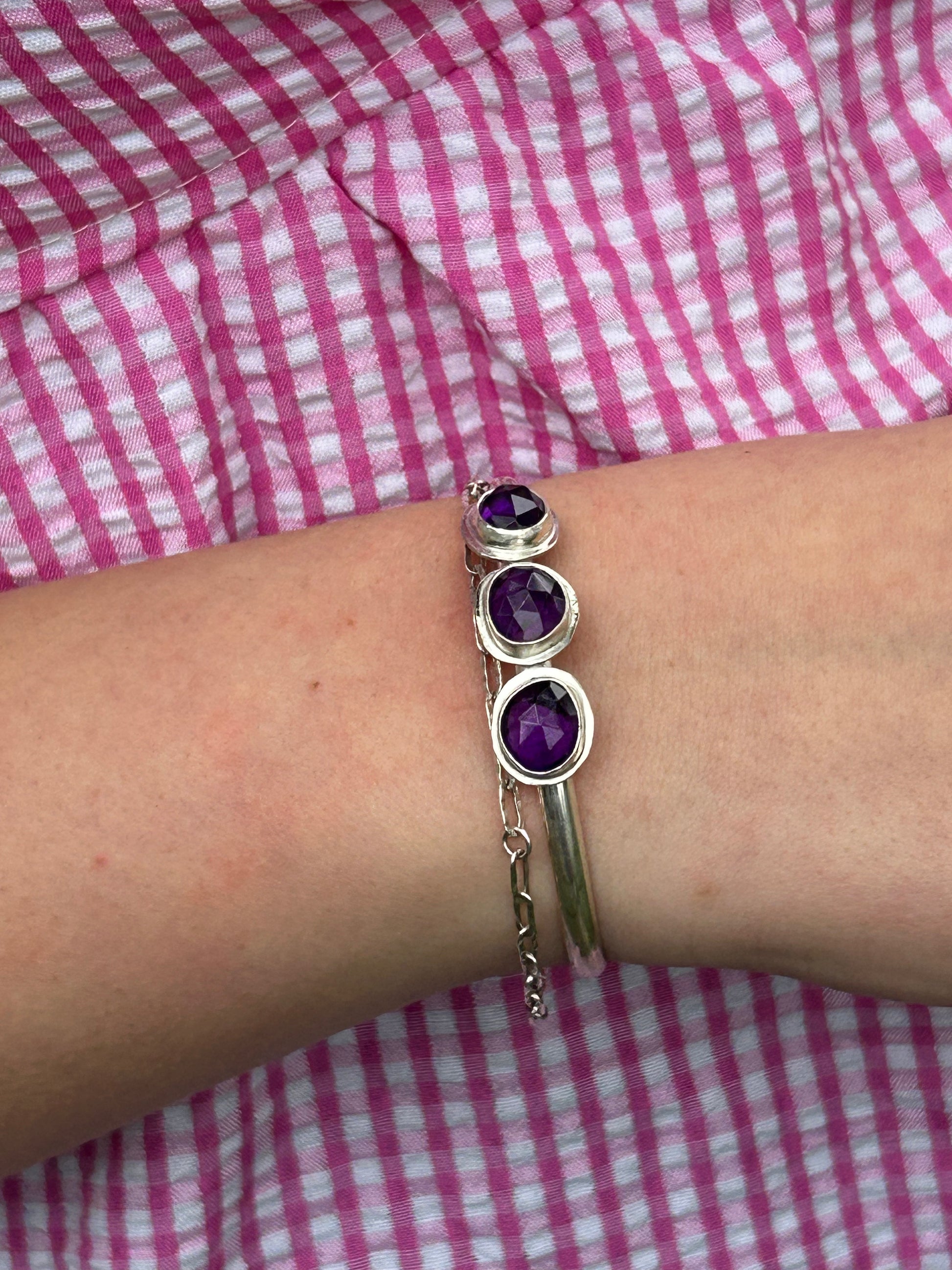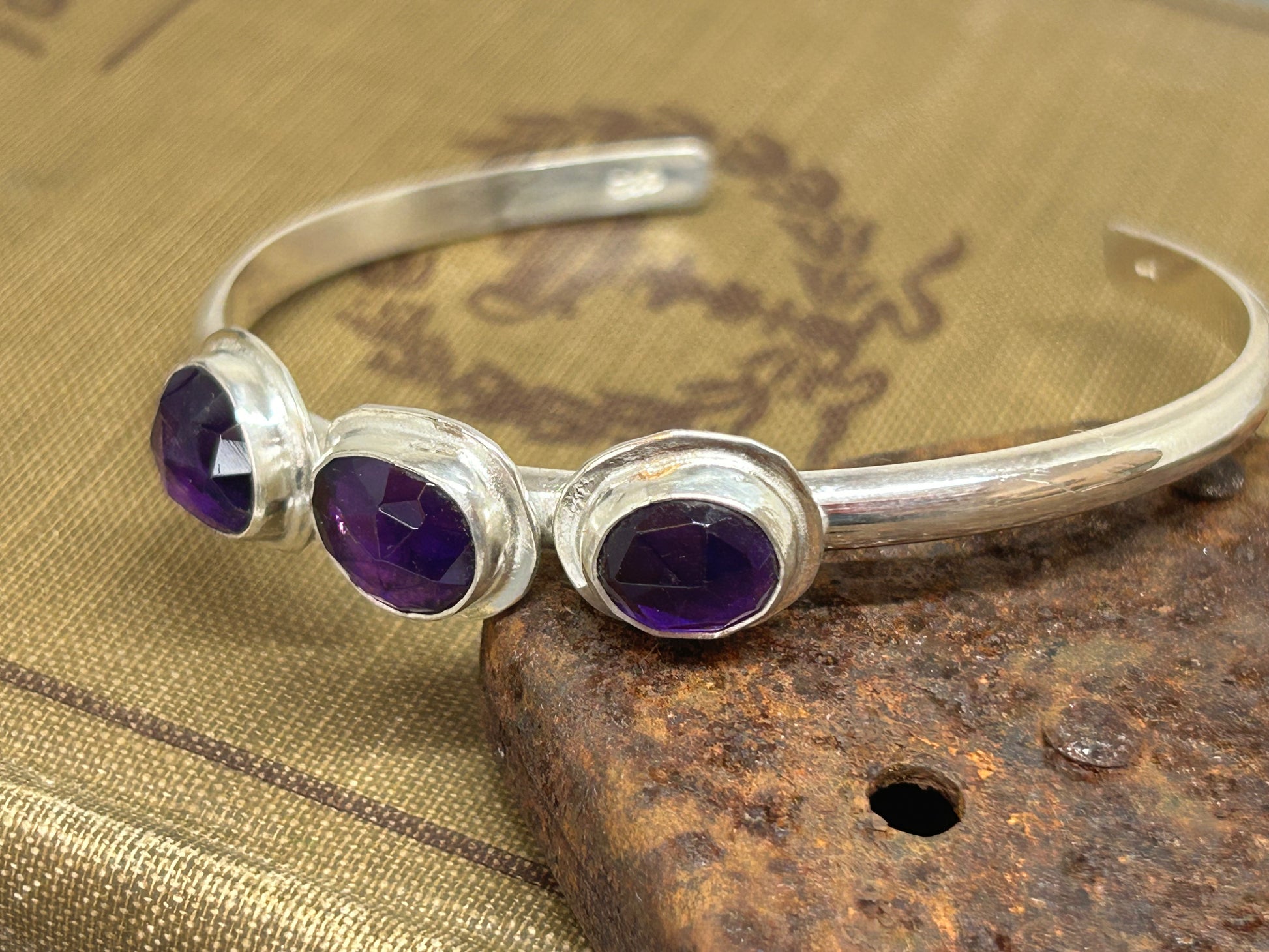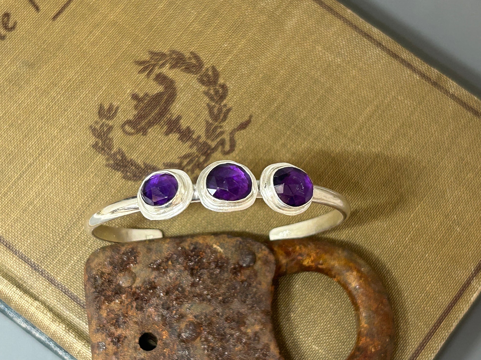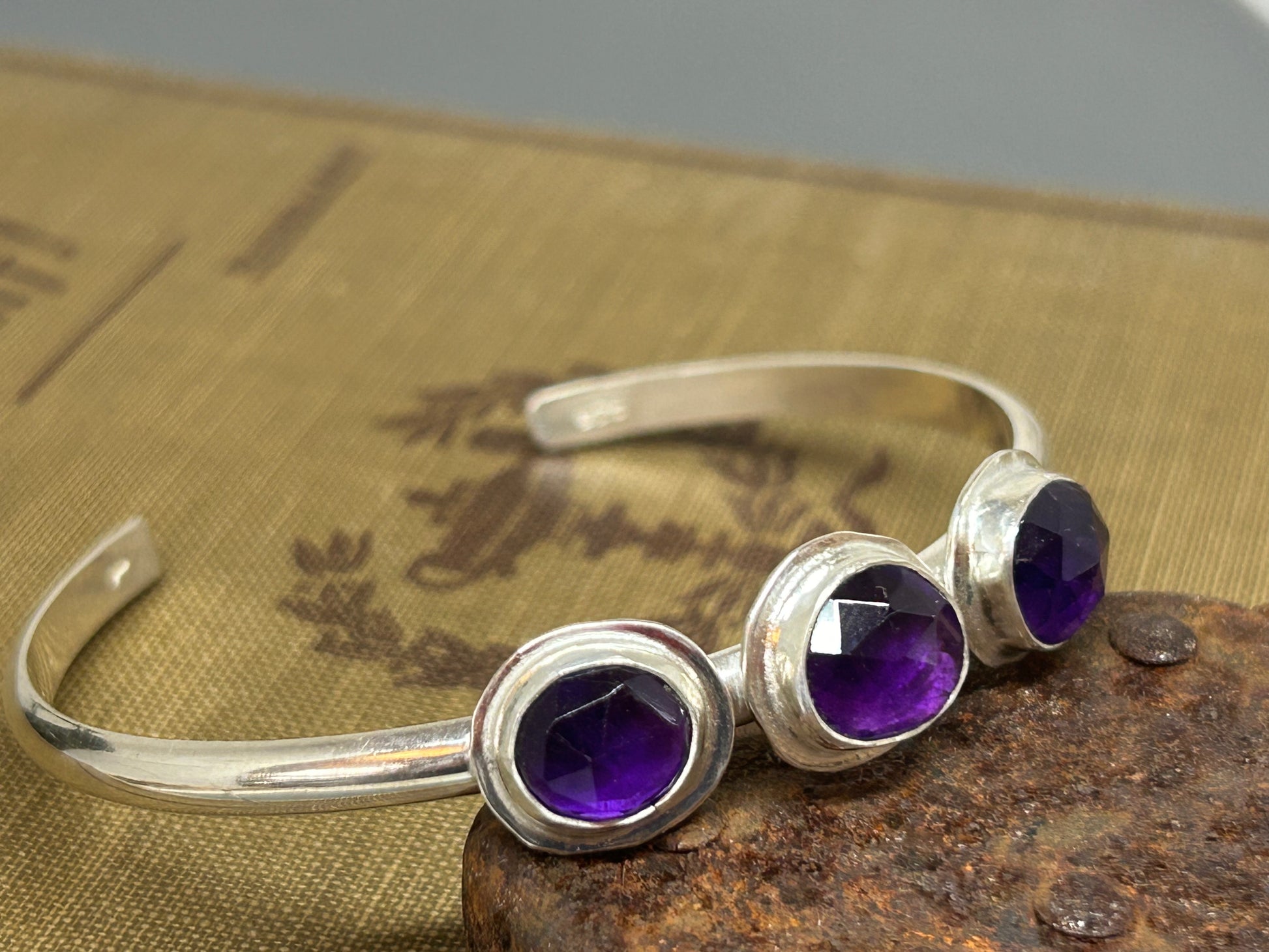 Handcrafted sterling silver cuff featuring faceted Amethyst stones.