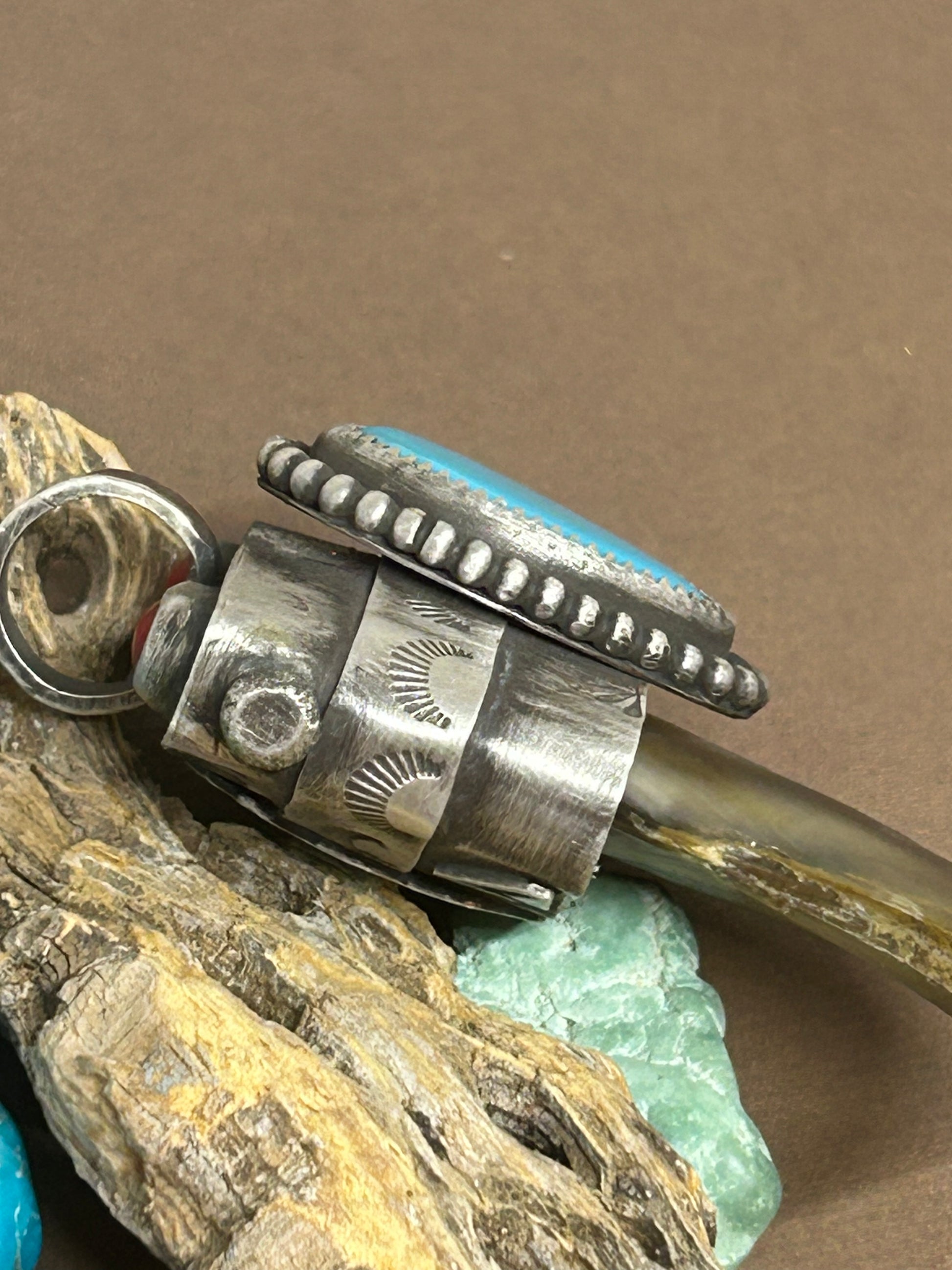 Bear claw set in a sterling silver cap accented with Pilot Mountain turquoise, bamboo coral and sterling silver embellishments.
