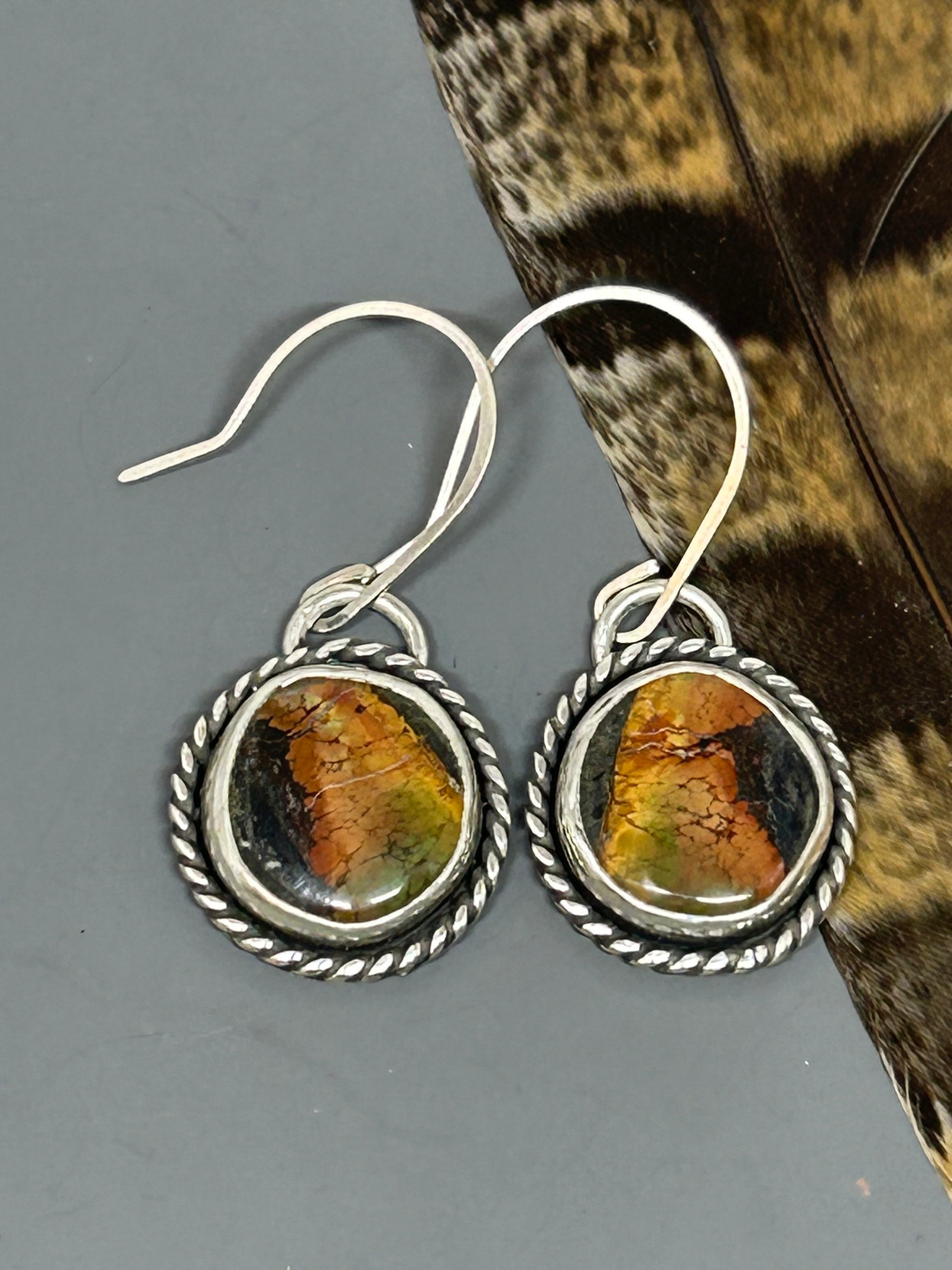 Round Blackjack turquoise set in sterling silver accented with silver twist wire and a soft patina. These earrings are 2.75 inches long.