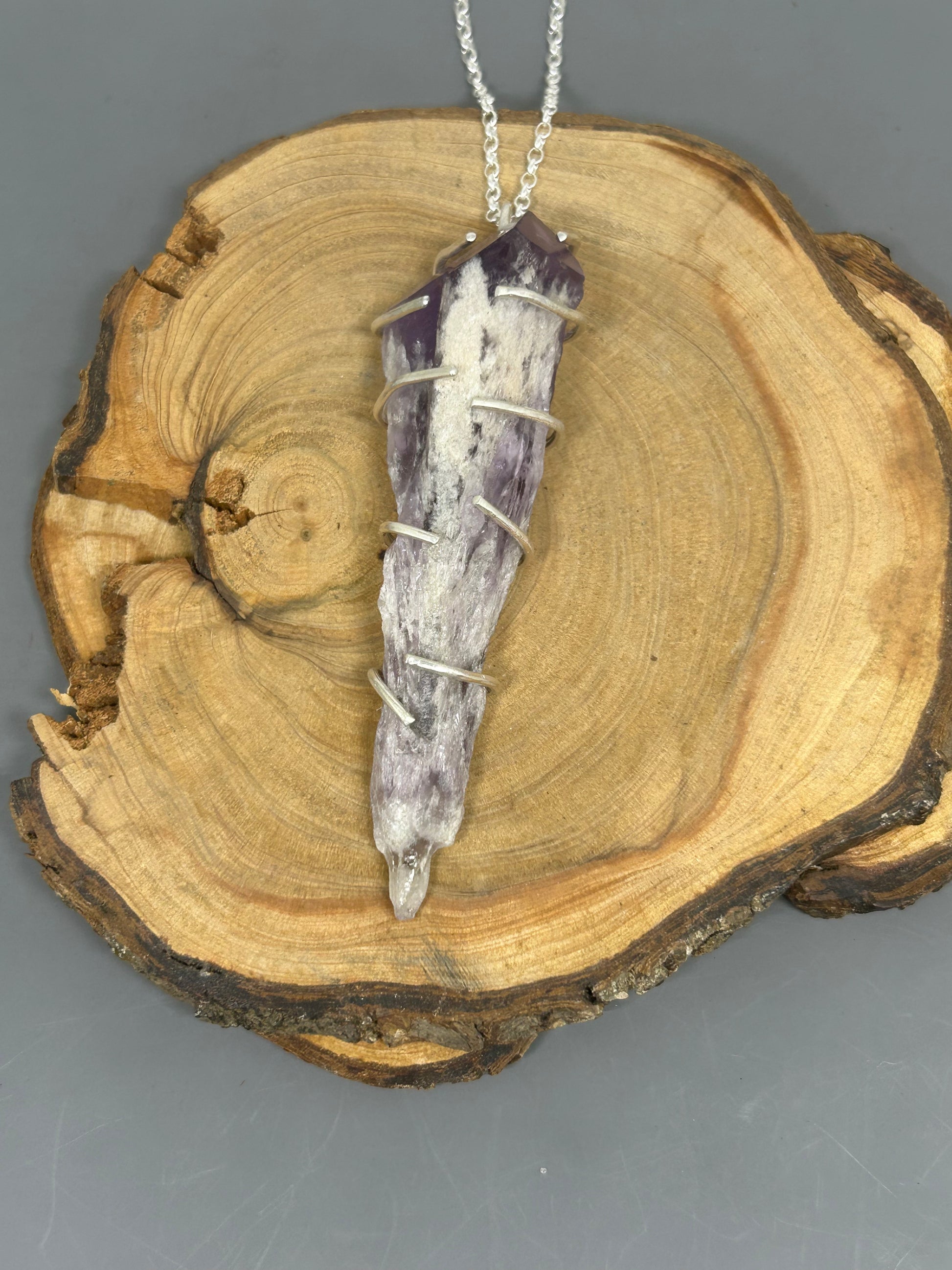 My 10 year old grandson Bryson crafted this necklace. Beautiful raw Amethyst Crystal prong set in sterling silver on an 18 inch sterling silver chain.