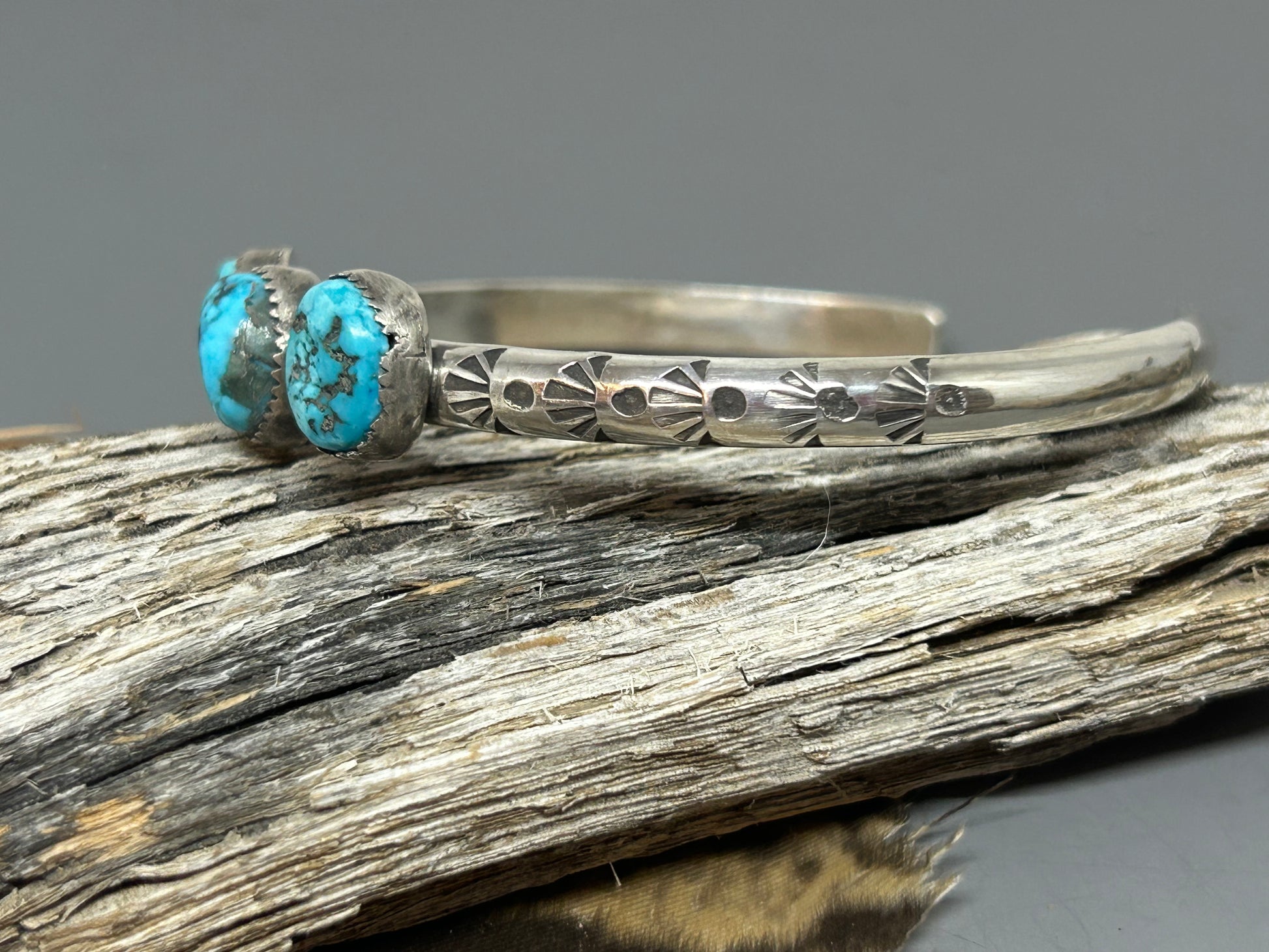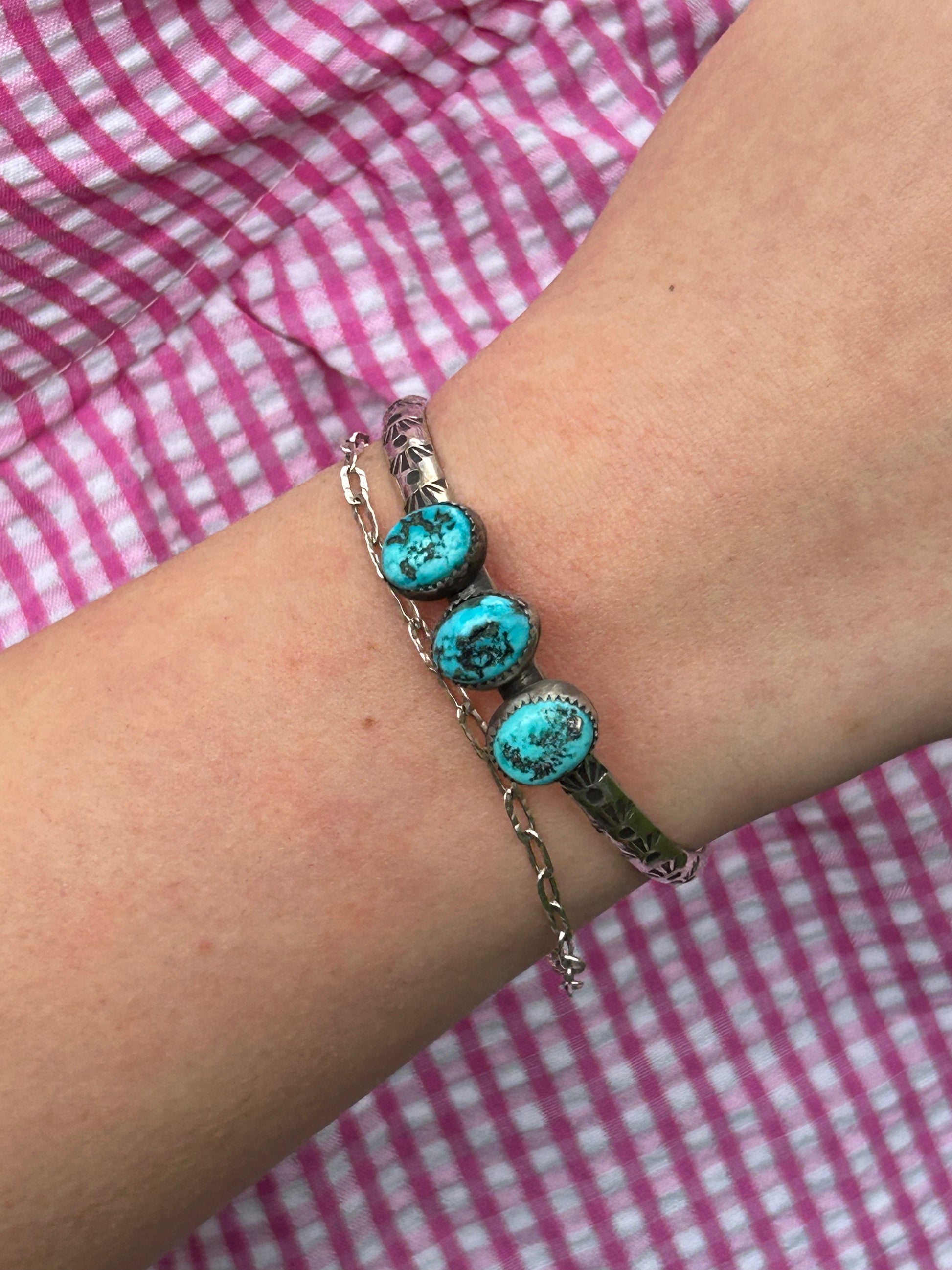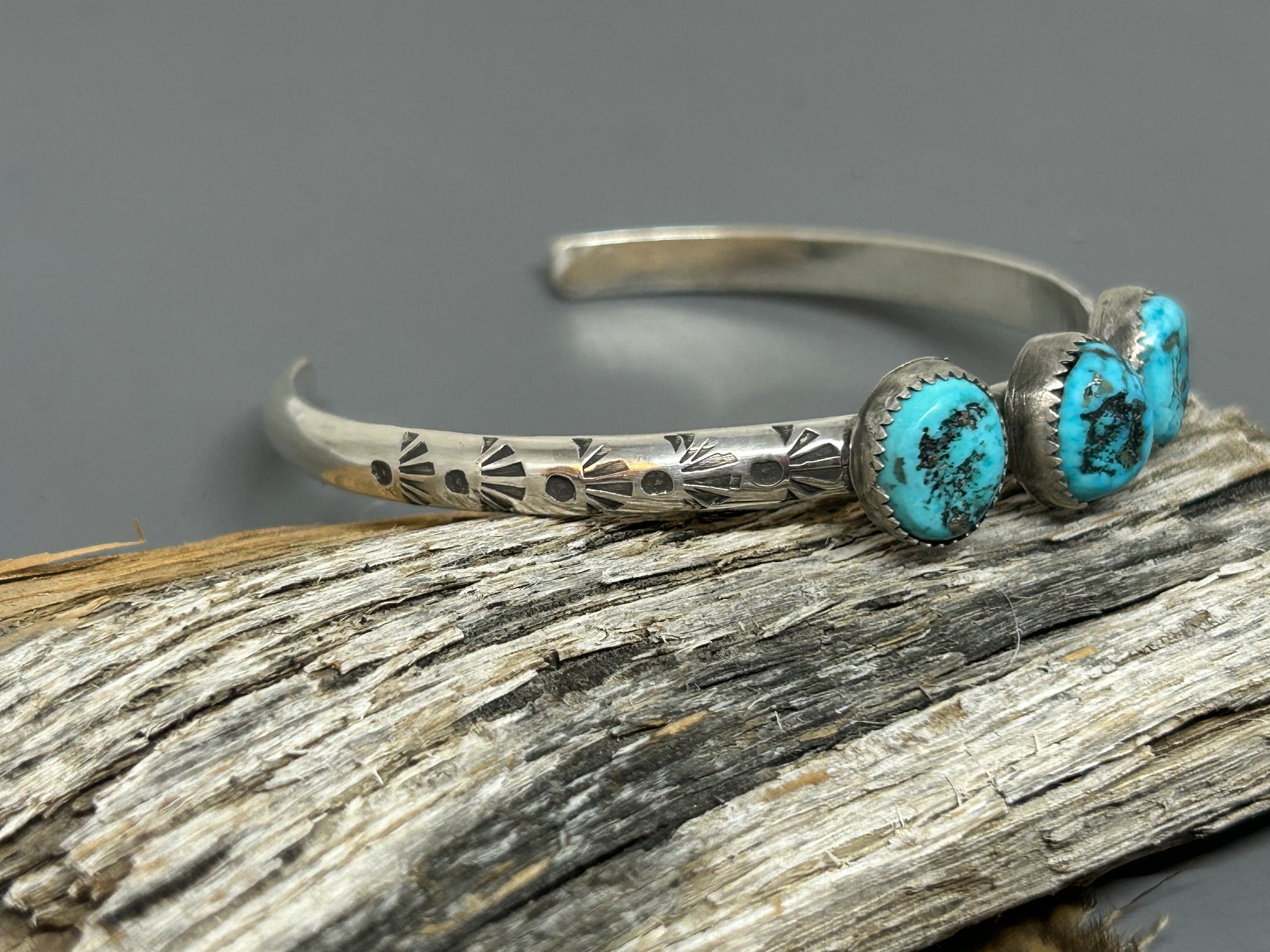 Three pieces of Morenci Turquoise set in fine silver serrated bezels. They sit atop a six inch 4 gauge sterling silver hand stamped cuff accented with soft patina.