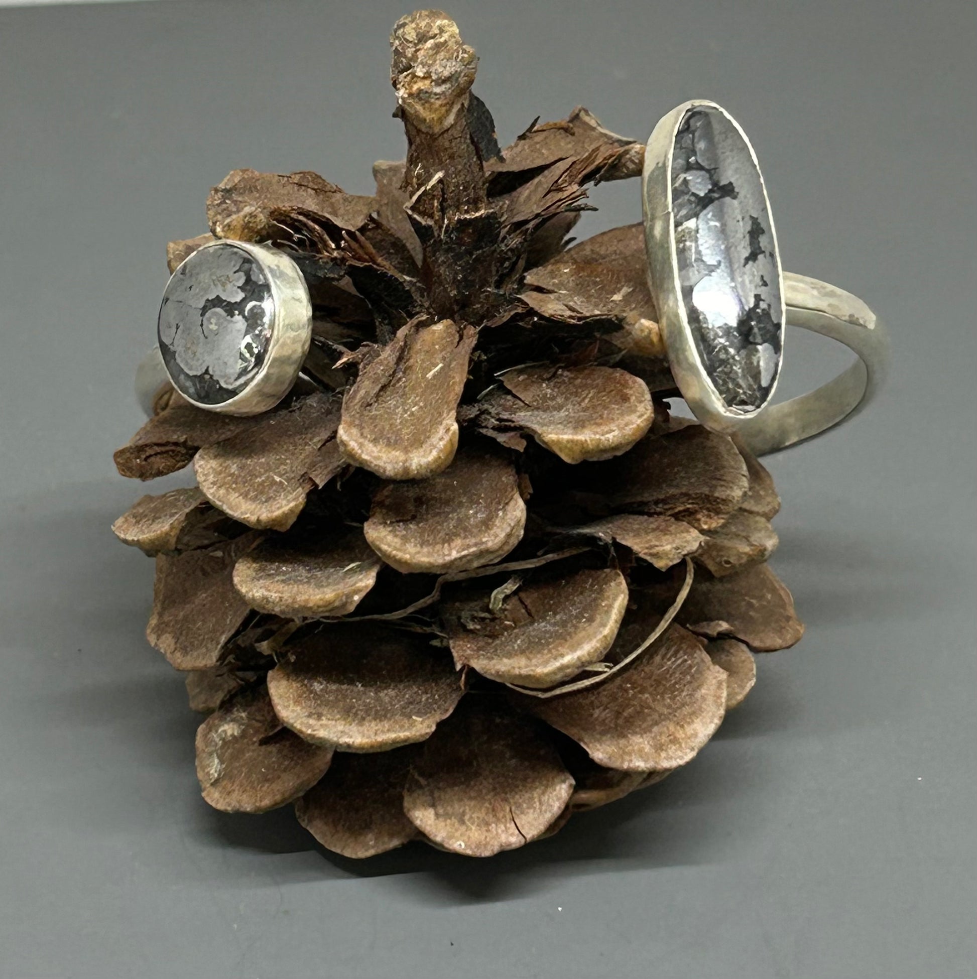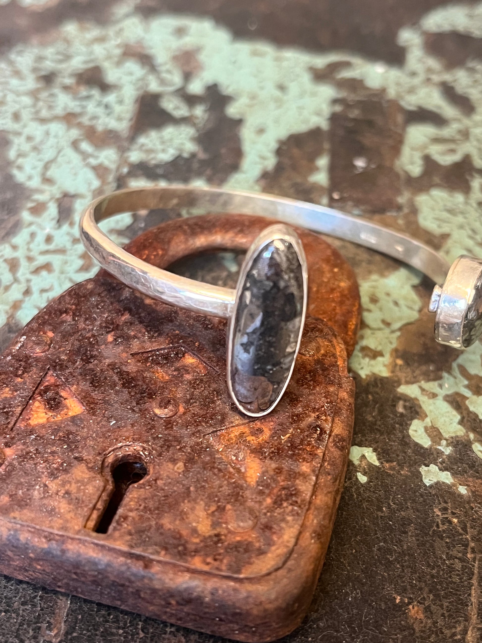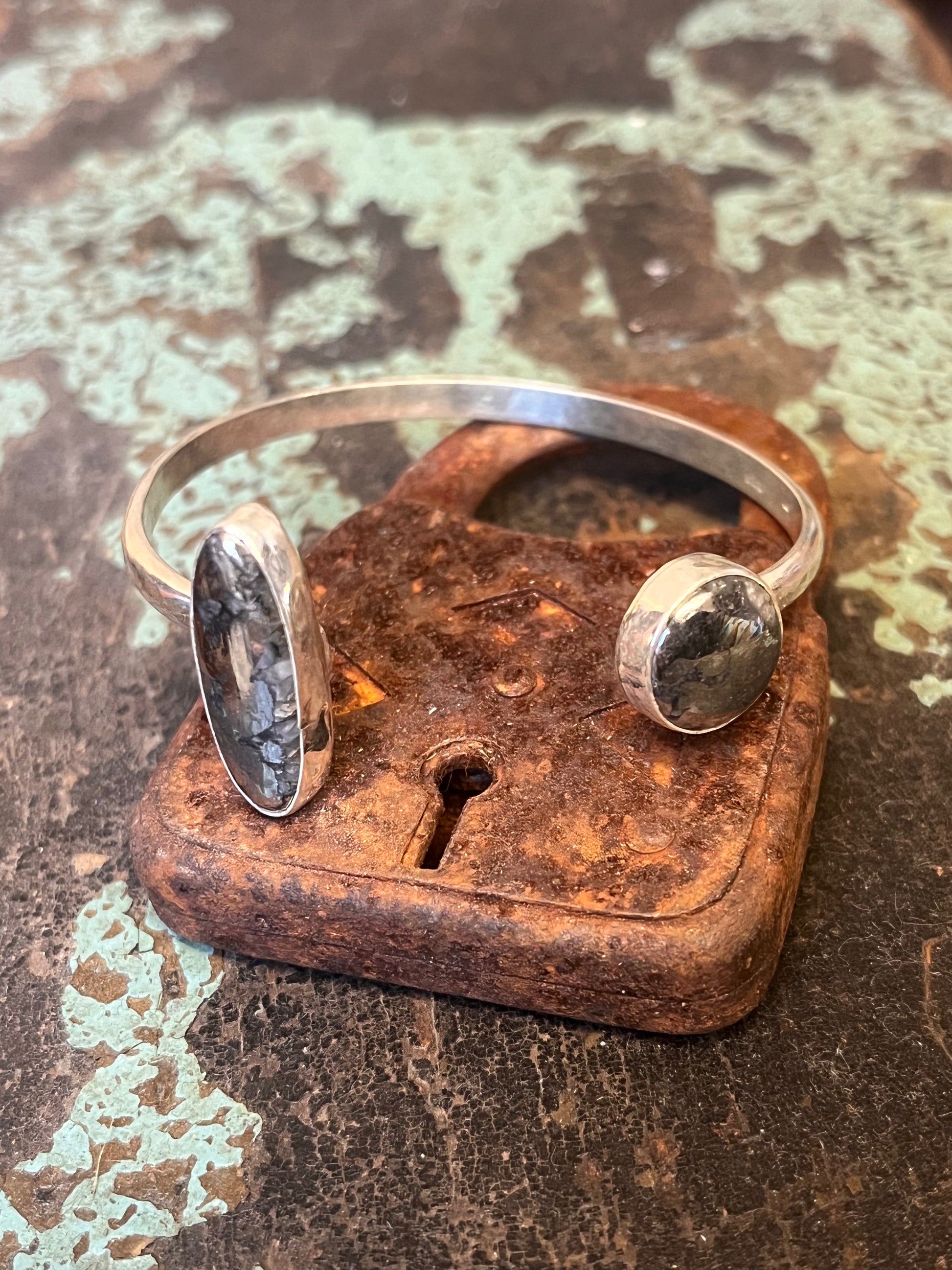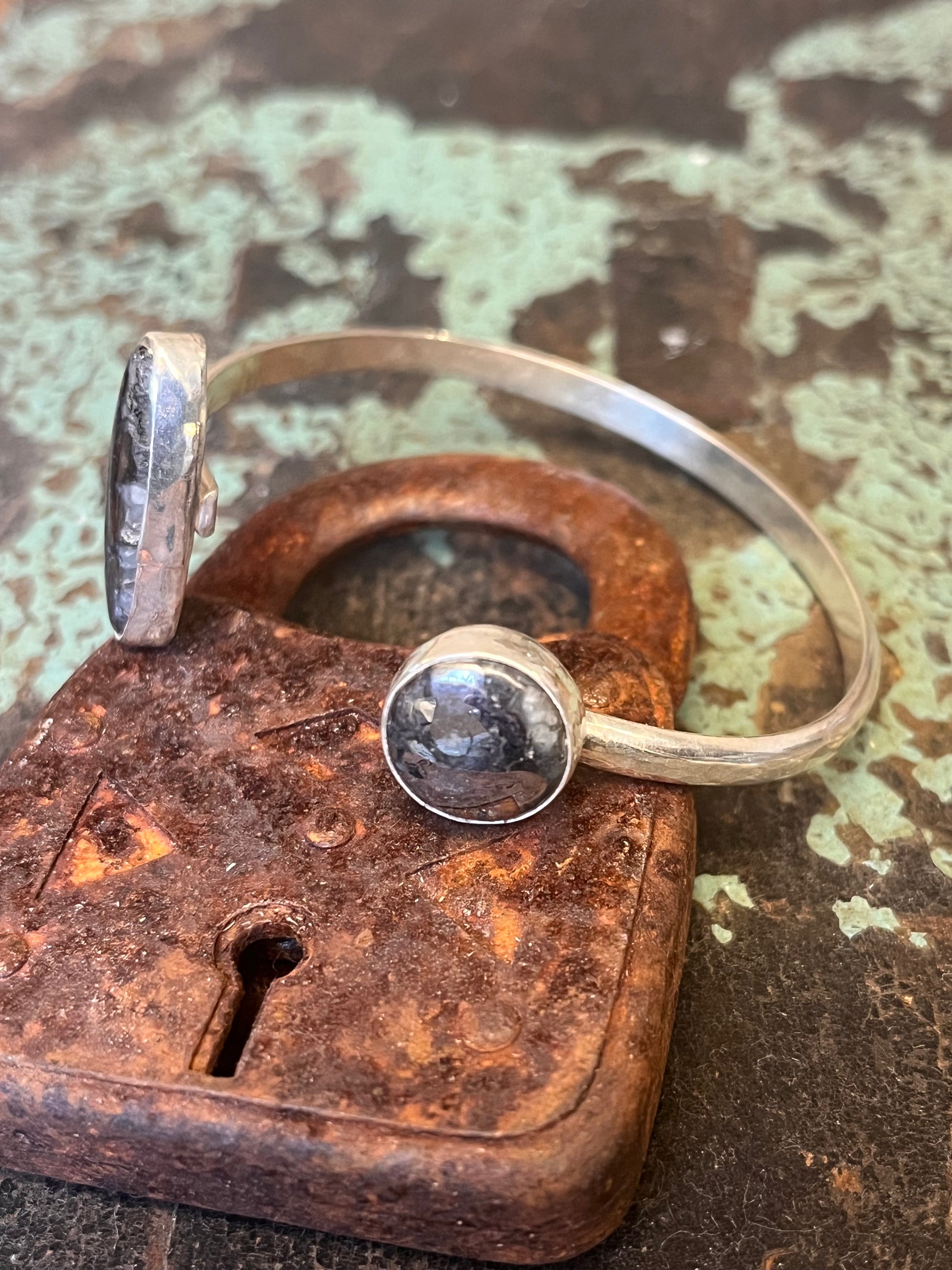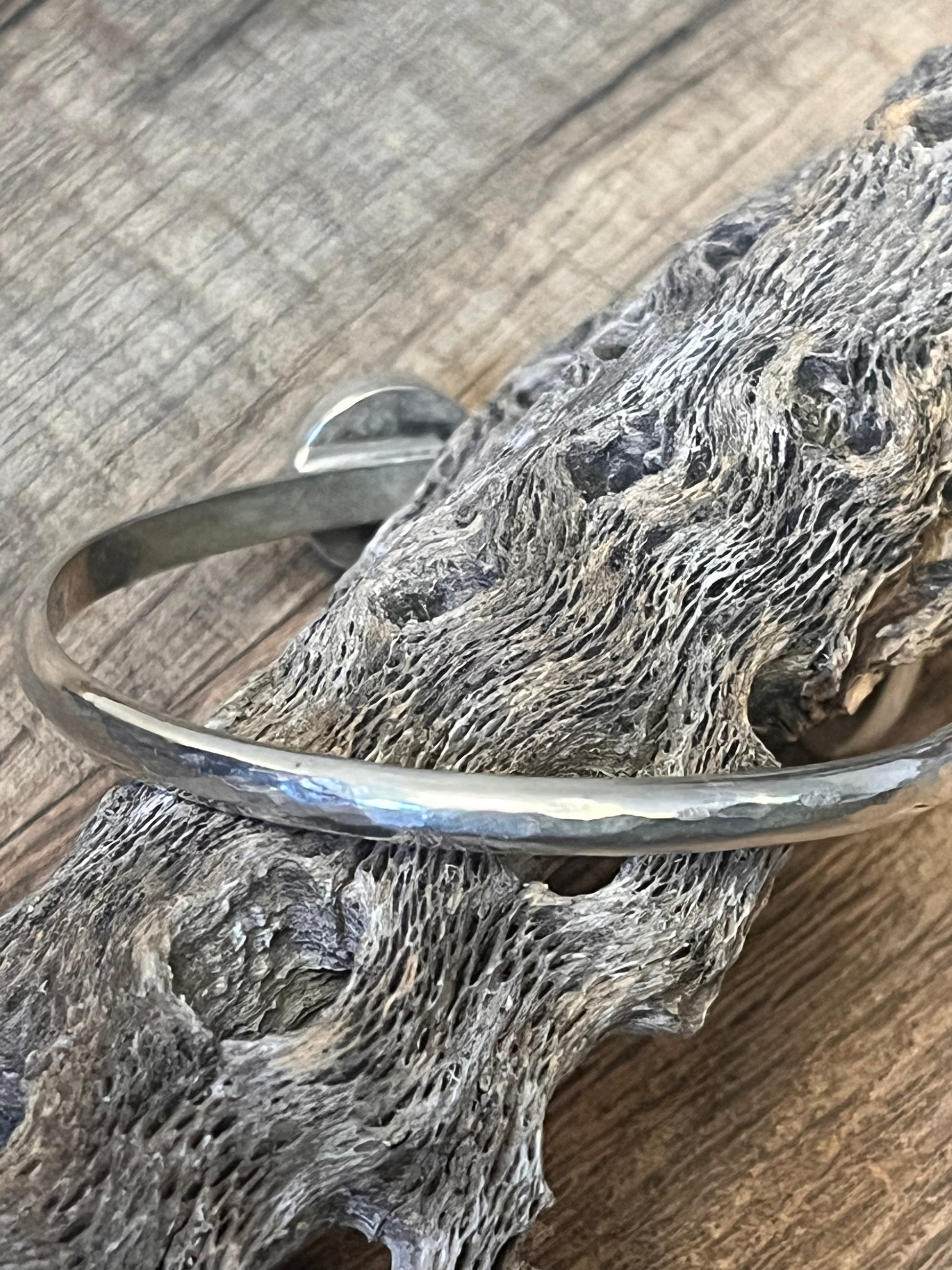 Natural silver cabochons set in sterling silver set on 6 gauge hammered silver half round wire. This cuff is six inches long with about a 1.25 inch gap.